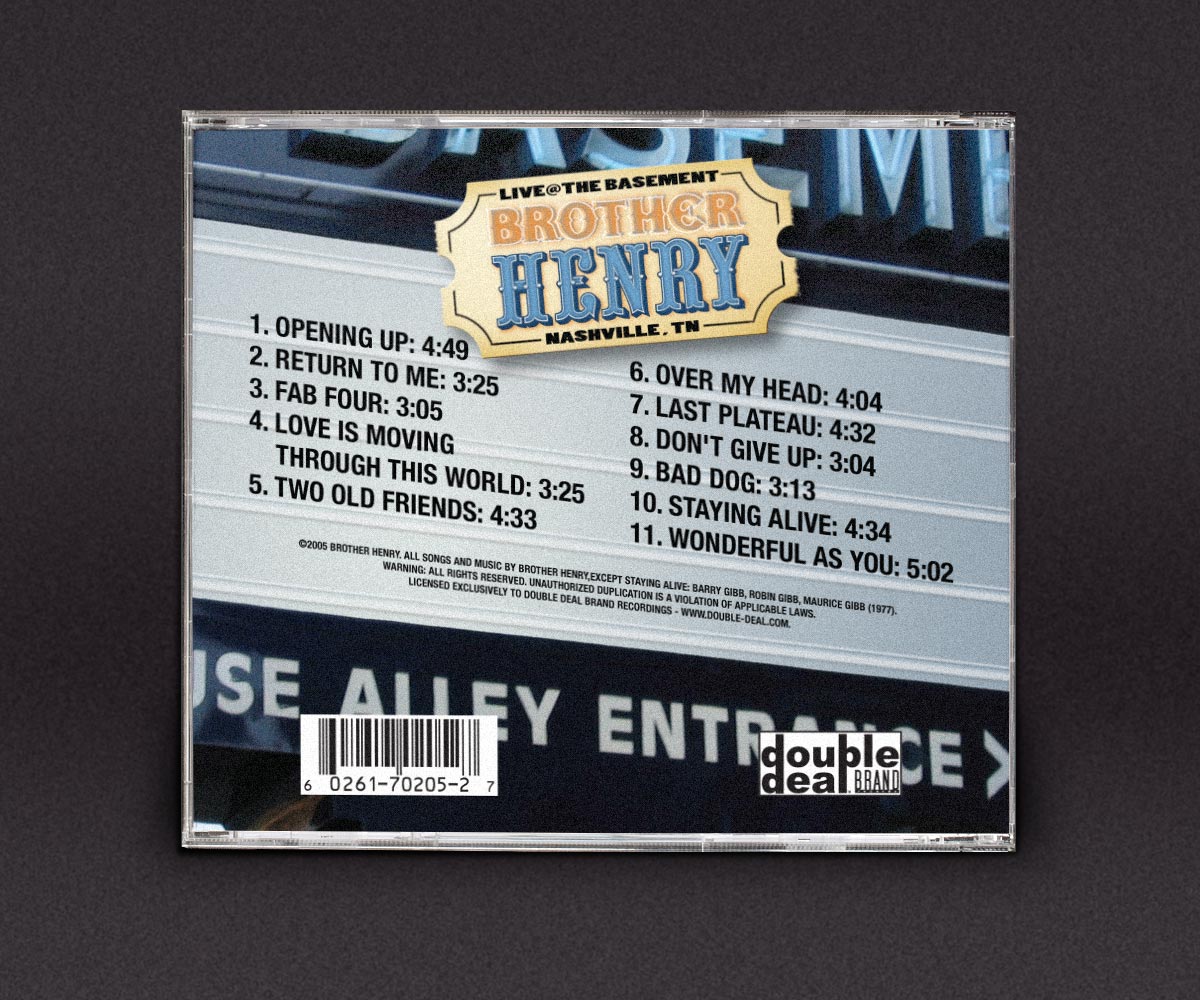 For Brother Henry’s Live CD recorded at the Nashville institution The Basement, I put on my photographer’s hat and captured the iconic sign. I added the text on the sign electronically as the concert had already happened when I got the assignment.