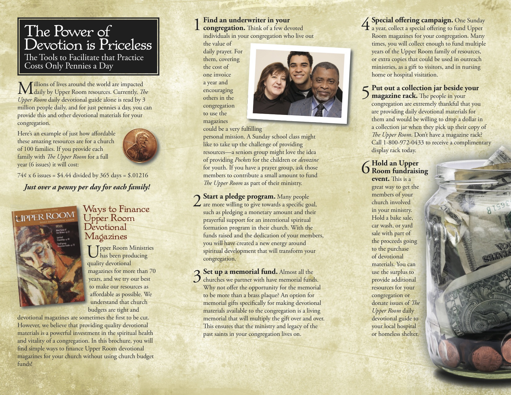 This brochure was a fundraiser trifold for Upper Room Magazine, a Christian daily devotional. The challenge was to appeal to older demographics to encourage them to support the magazine’s mission. I strode the line between the traditional “church” look and something out of a financial advisor’s office, too.